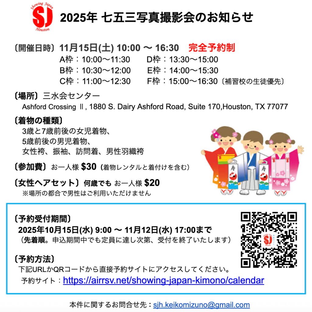 For our English-speaking guests, thank you for your interest in our events! This is a soft-opening of our photo event and is currently only open to Japanese speakers. Please check back in the future for more dates and times! Please contact houstonshowingjapan@gmail.com if you have further questions.